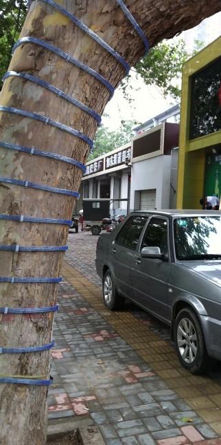 石家莊匯通路上一商家給門前的多棵法國(guó)梧桐樹纏上了燈帶,并以釘釘子的方式加以固定。每棵樹的樹身均密密麻麻地遍布釘子, 據(jù)“屌絲變學(xué)霸”目測(cè),每棵樹至少被釘30顆釘子。